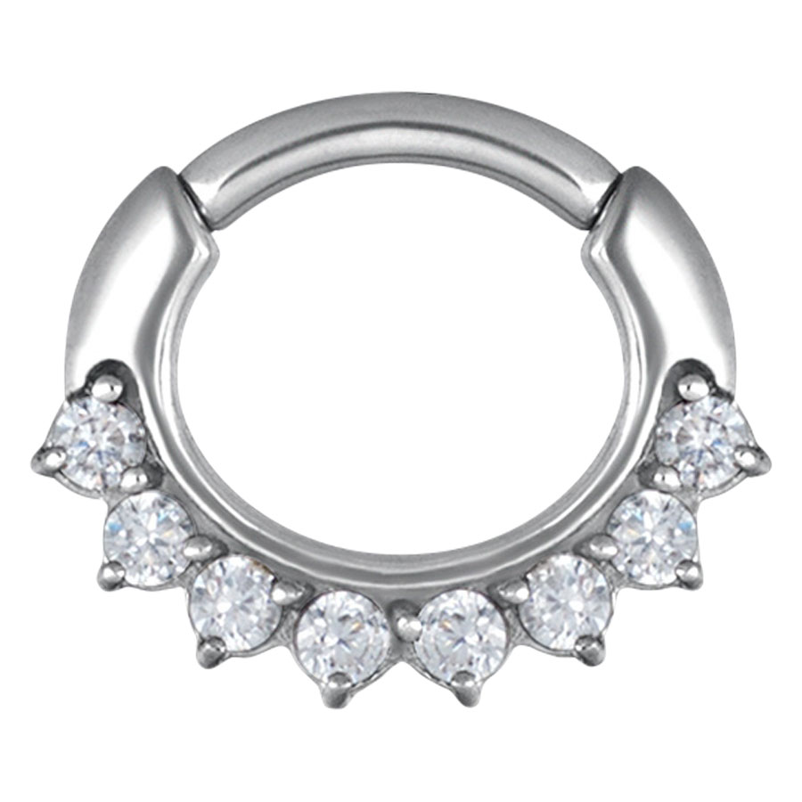 Nuestro Glossy Clicker de bisagra de alta calidad, fabricado en acero inoxidable plateado, se destaca por sus hermosas piedras que te harán brillar incluso a la distancia. El piercing cuenta con un cierre de bisagra que facilita su inserción. Es ideal para tu piercing de septum, pero también se puede usar en la oreja o en el frenillo (Smiley). Las piedras tienen un diámetro de aproximadamente 1.5 mm.