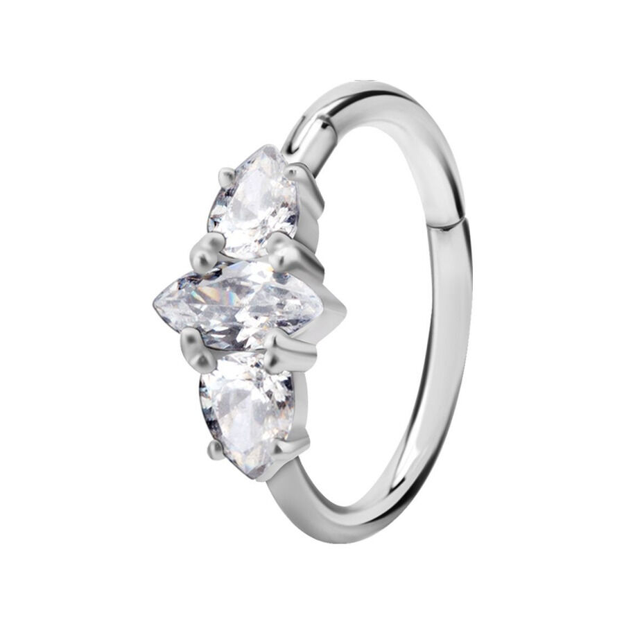 Nuestro Jewelled Crown Clicker de alta calidad destaca especialmente por los distintos tamaños de piedras preciosas, que le dan al piercing el aspecto de una majestuosa corona. Los tamaños son perfectos para tu Conch. Gracias a su cierre abatible, es muy fácil cambiar tu piercing sin ayuda. ¡Reinvéntate!