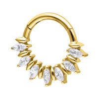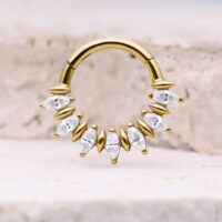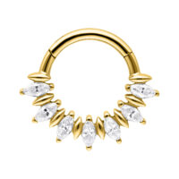 El Marquise Sunburst Aro de Septum combina un diseño elegante con una gran versatilidad. Las piedras claras en forma marquise están montadas en una disposición simétrica tipo Sunburst, creando un look lujoso y con mucho estilo.