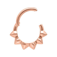 Nuestro Spikes Clicker está fabricado en acero inoxidable de alta calidad y es ideal para tu piercing de septum. El piercing cuenta con una barra articulada y curvada, que permite una colocación fácil y cómoda, sin necesidad de ayuda.