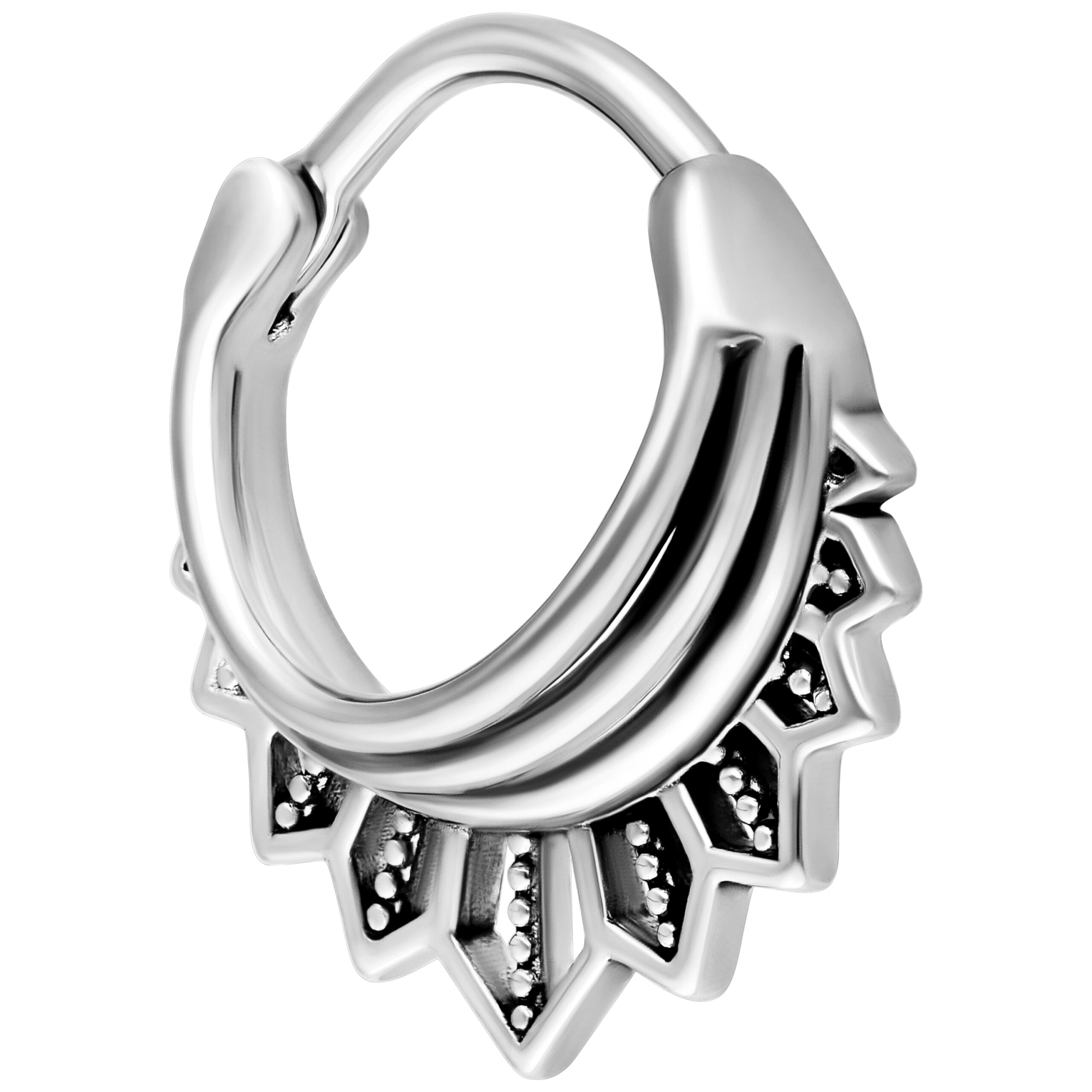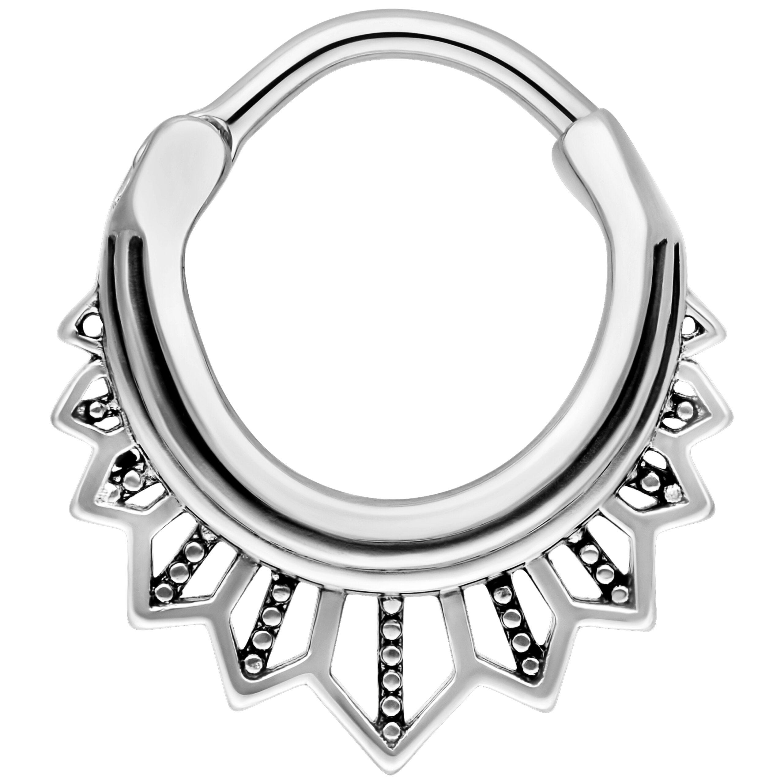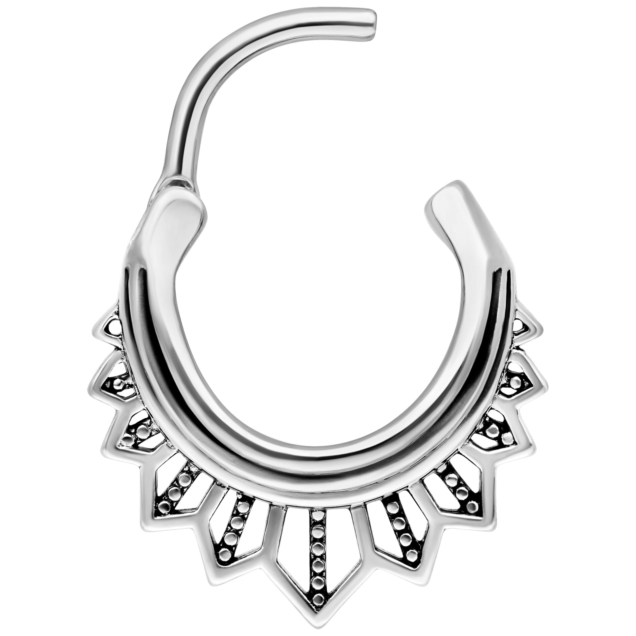 Nuestro Tigerlily Clicker está fabricado con acero inoxidable de alta calidad y es ideal para tu piercing de septum. Este piercing cuenta con una bisagra curva que facilita su colocación. ¿Tienes un carácter fuerte y te encantan los diseños indígenas? ¡Entonces este aro nasal es perfecto para ti!