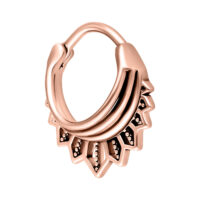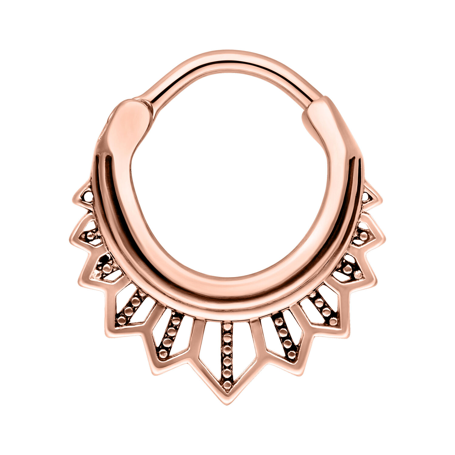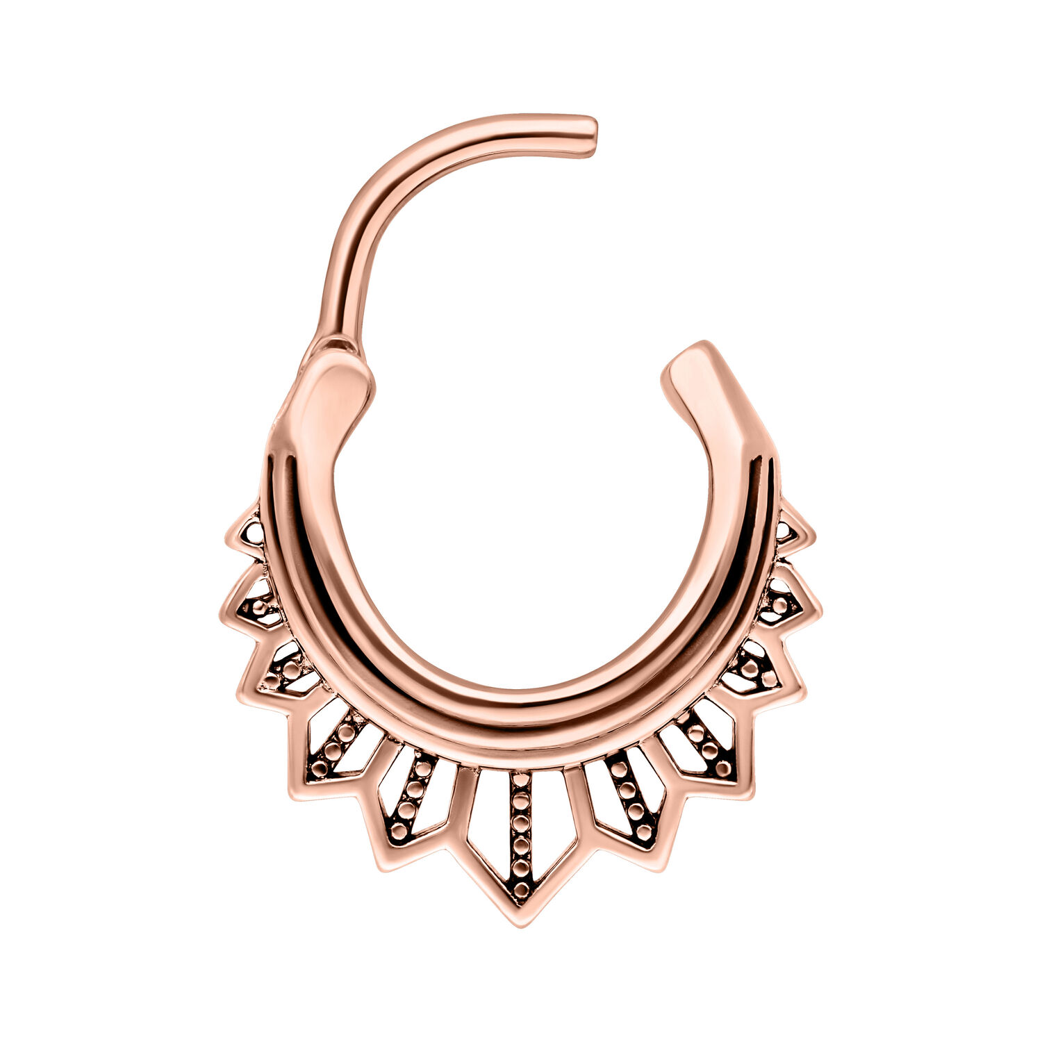 Nuestro Tigerlily Clicker está hecho de acero inoxidable de alta calidad y es ideal para tu piercing de septum. El piercing cuenta con una bisagra curva que facilita su colocación. ¿Tienes un carácter fuerte y te encantan los diseños de inspiración india? ¡Entonces este aro para la nariz es perfecto para ti!