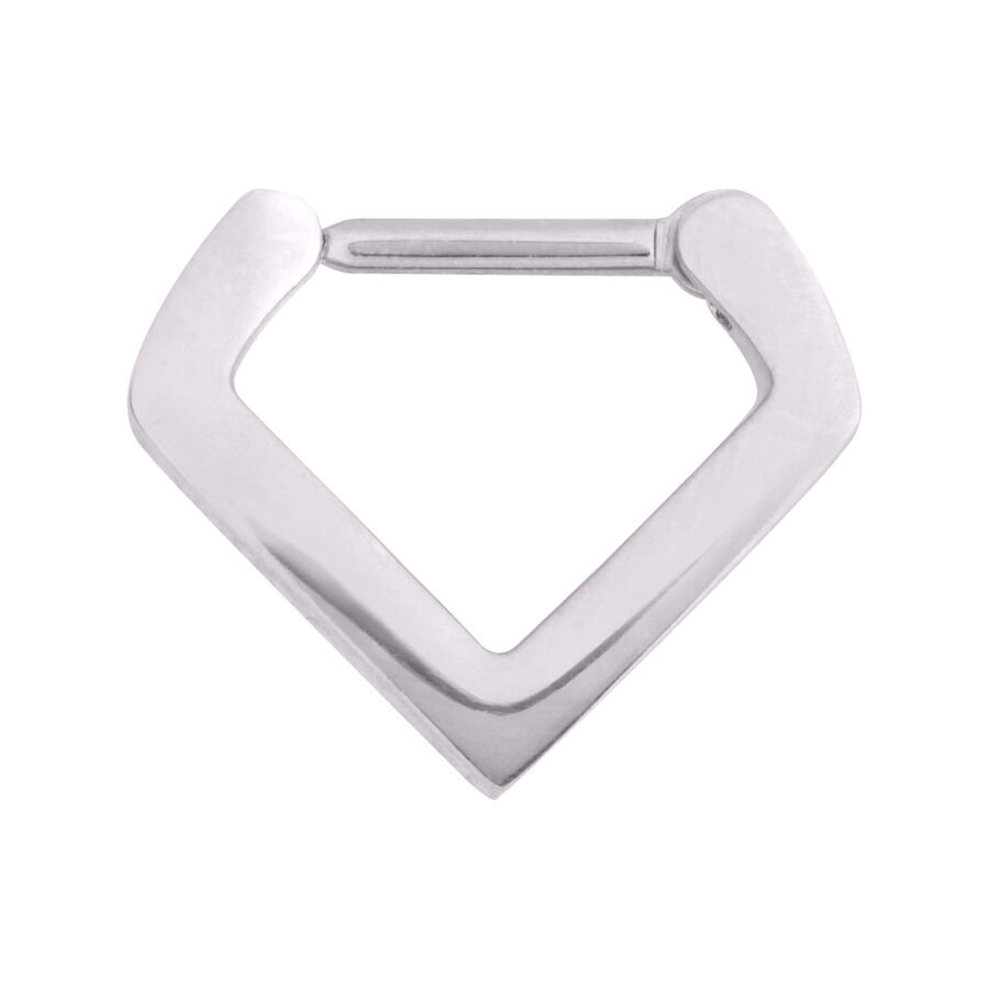 Nuestro Triangle Septum Clicker, como su nombre indica, tiene una forma triangular muy cool. Este piercing de septum único se abre y coloca fácilmente gracias a su cierre tipo click. También se puede llevar en diferentes piercings, como Septum o Daith. La longitud de la barra del piercing es de 7,0 mm. El diámetro interno vertical (distancia entre la barra y la punta interior inferior) es de 8,0 mm y el diámetro interno horizontal es de 10,0 mm. Además, el piercing está fabricado en acero inoxidable de alta calidad.