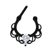 Nuestro Septum Clicker Fairytale tiene un toque oriental y es un verdadero imán de miradas. Este clicker para el septum está adornado con un pequeño cristal blanco engastado y varias filas de cadenas fijas. Fabricado en acero inoxidable negro de alta calidad, el septum clicker cuenta con una barra recta de 6 mm de longitud. Gracias al mecanismo de clic, el piercing es muy fácil de abrir e insertar.