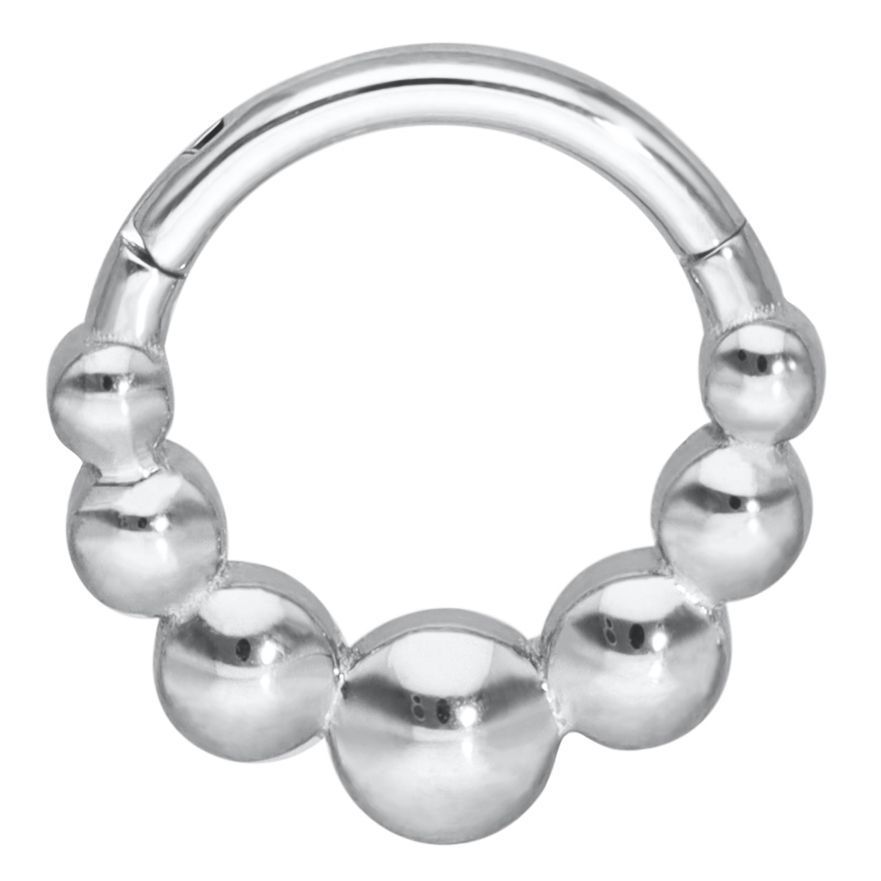 Nuestro clicker de septum Flat Balls está fabricado en acero inoxidable de alta calidad y es ideal para su piercing de septum. Dispone de una barra de bisagra curvada que te facilita la inserción del piercing, ¡y todo sin ayuda!