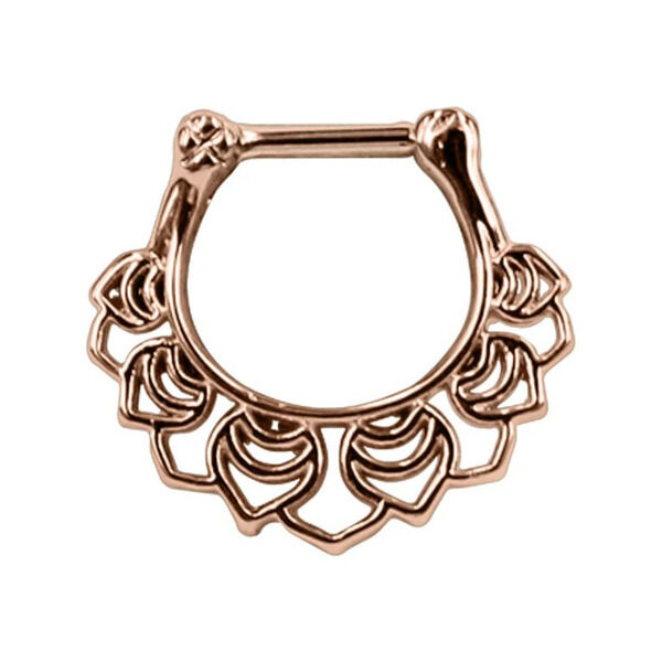 Nuestro Floral Septum Clicker es un piercing precioso con un diseño floral de flores. El Septum Piercing tiene una barra recta de acero inoxidable rosé de alta calidad, mientras que el resto del piercing está hecho de metal. Cuenta con un práctico cierre de clic, que permite abrir y colocar el piercing fácilmente. Además, el piercing también se puede usar, por ejemplo, para tu Daith Piercing.