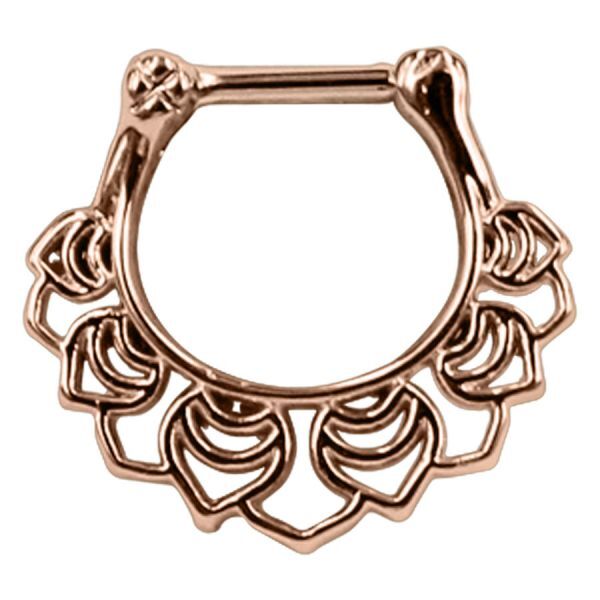 Nuestro Floral Septum Clicker es un piercing precioso con un diseño floral de flores. El Septum Piercing tiene una barra recta de acero inoxidable rosé de alta calidad, mientras que el resto del piercing está hecho de metal. Cuenta con un práctico cierre de clic, que permite abrir y colocar el piercing fácilmente. Además, el piercing también se puede usar, por ejemplo, para tu Daith Piercing.