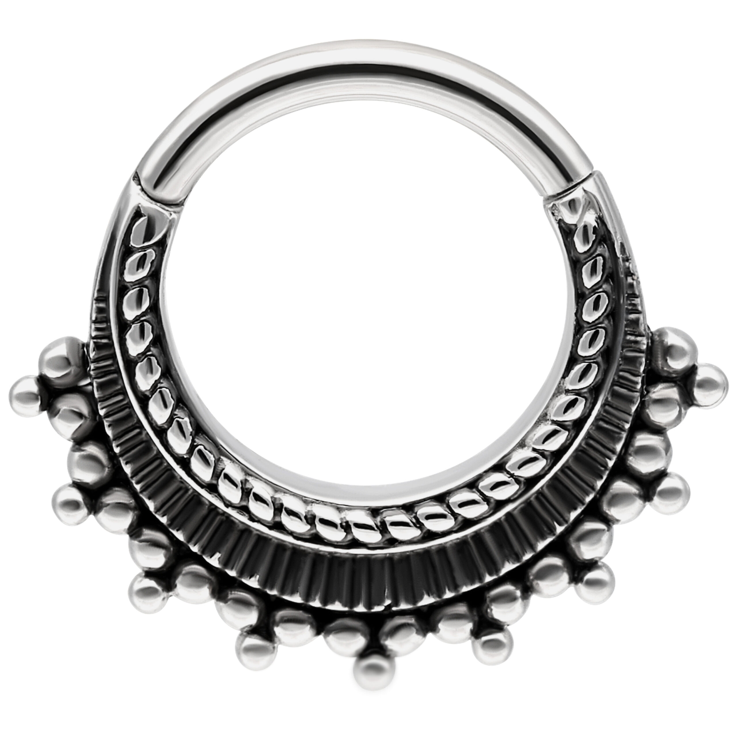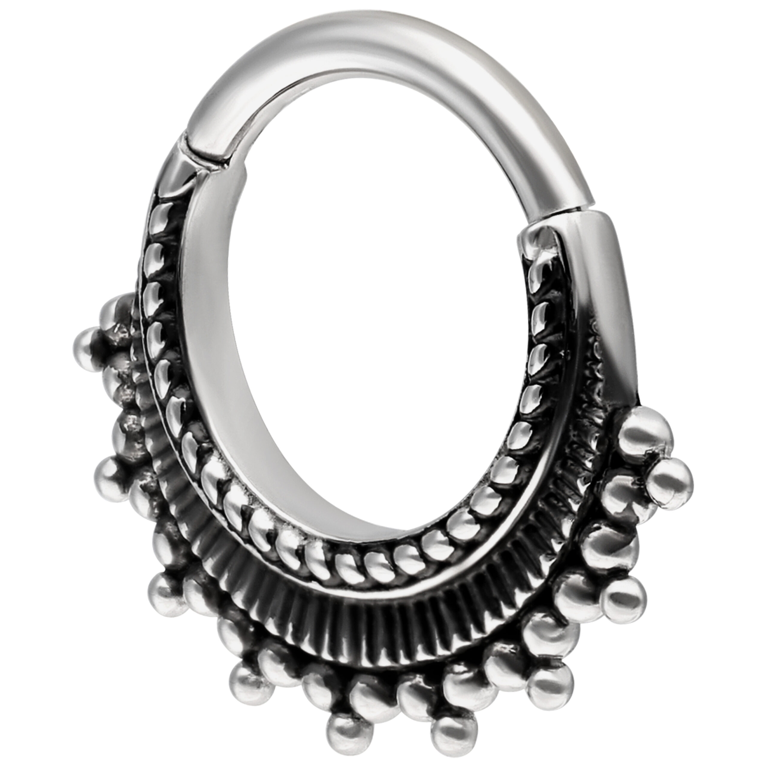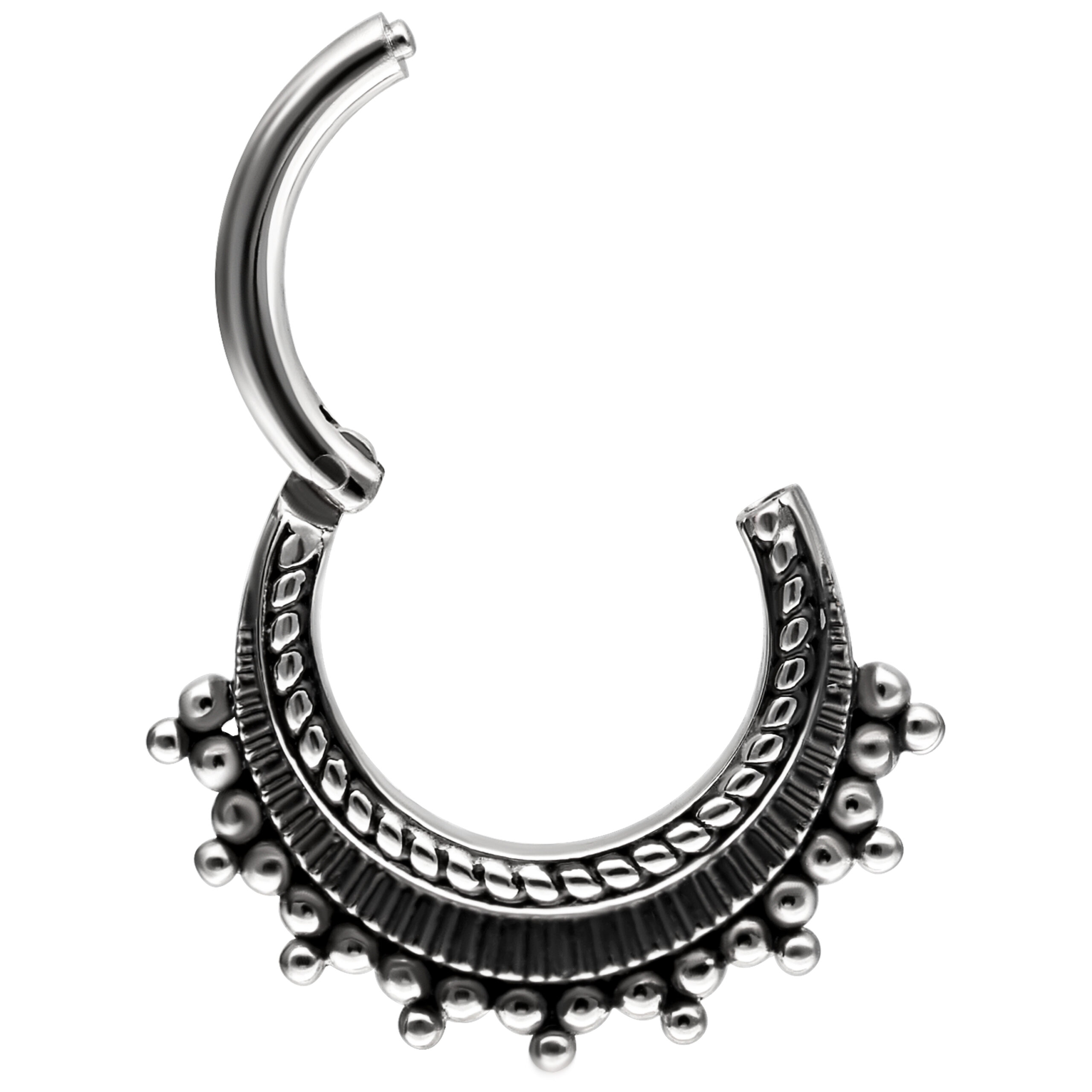 Está fabricado en acero inoxidable de alta calidad y es ideal para tu piercing en el septum o daith. Este piercing cuenta con una barra curvada que facilita su colocación, ¡y todo sin necesidad de ayuda!