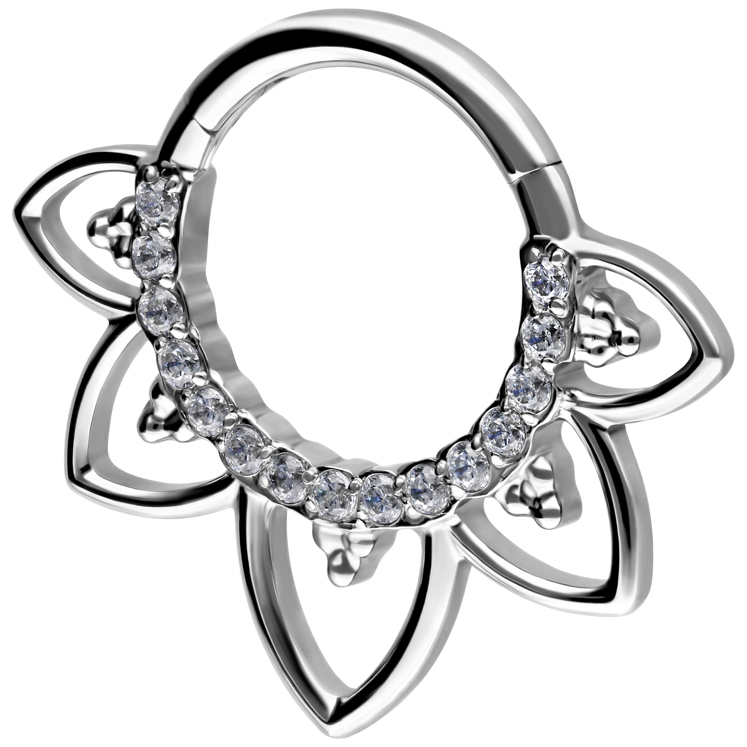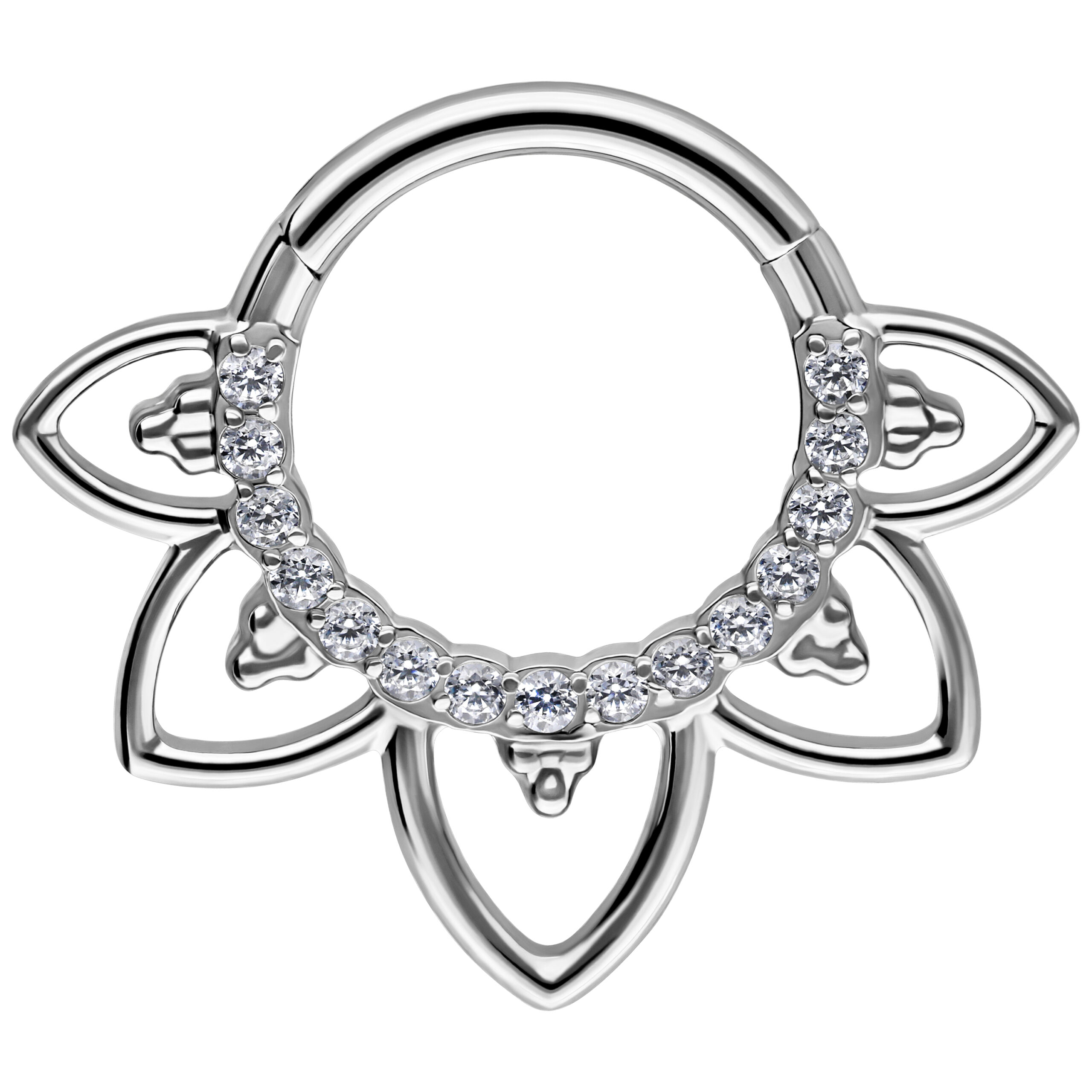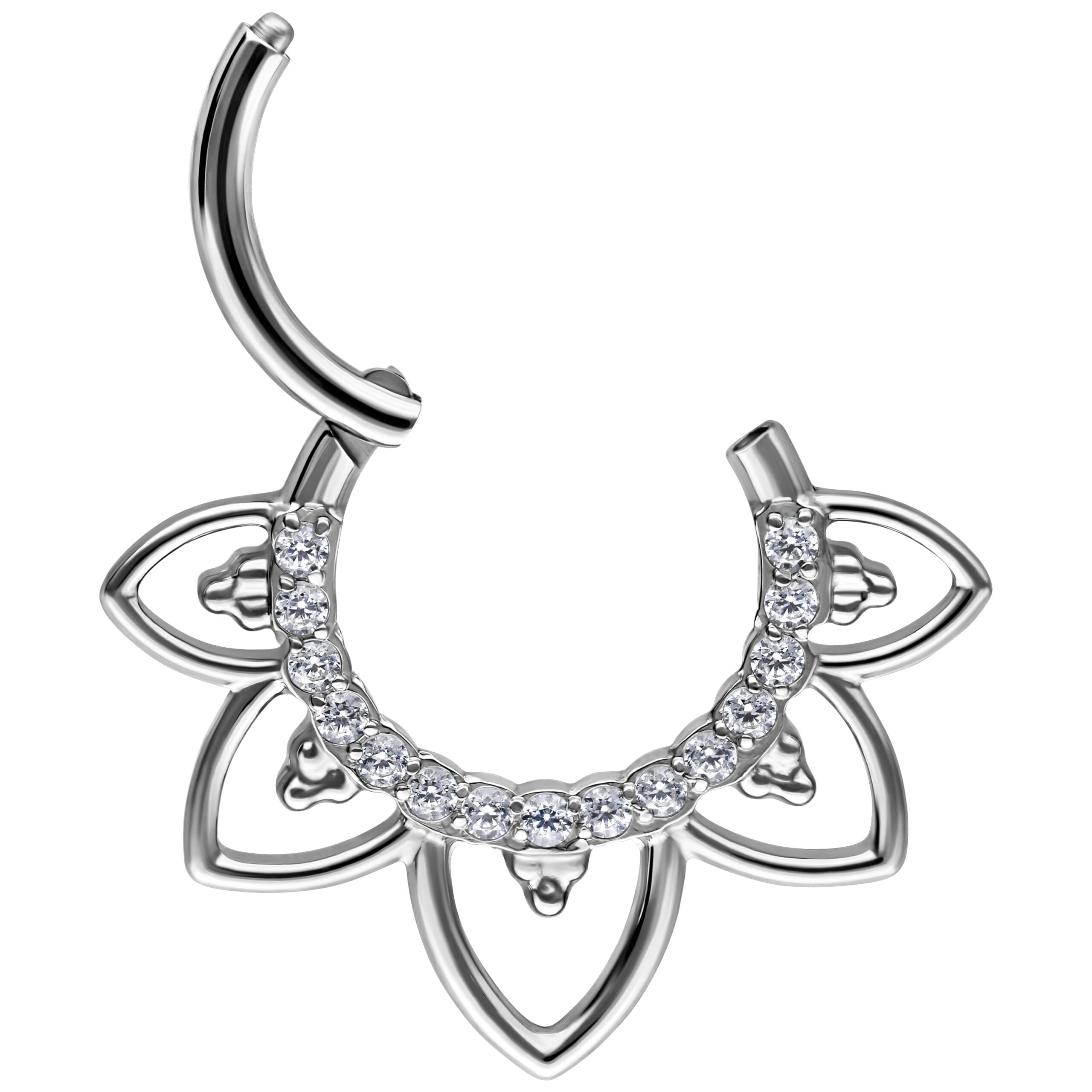 Nuestro Oriental Crystal Septum Clicker está hecho de acero inoxidable de alta calidad y es ideal tanto para tu piercing de septum como para el de Daith. El piercing cuenta con una barra de bisagra curvada, lo que te permite ponerlo fácilmente sin necesidad de ayuda.