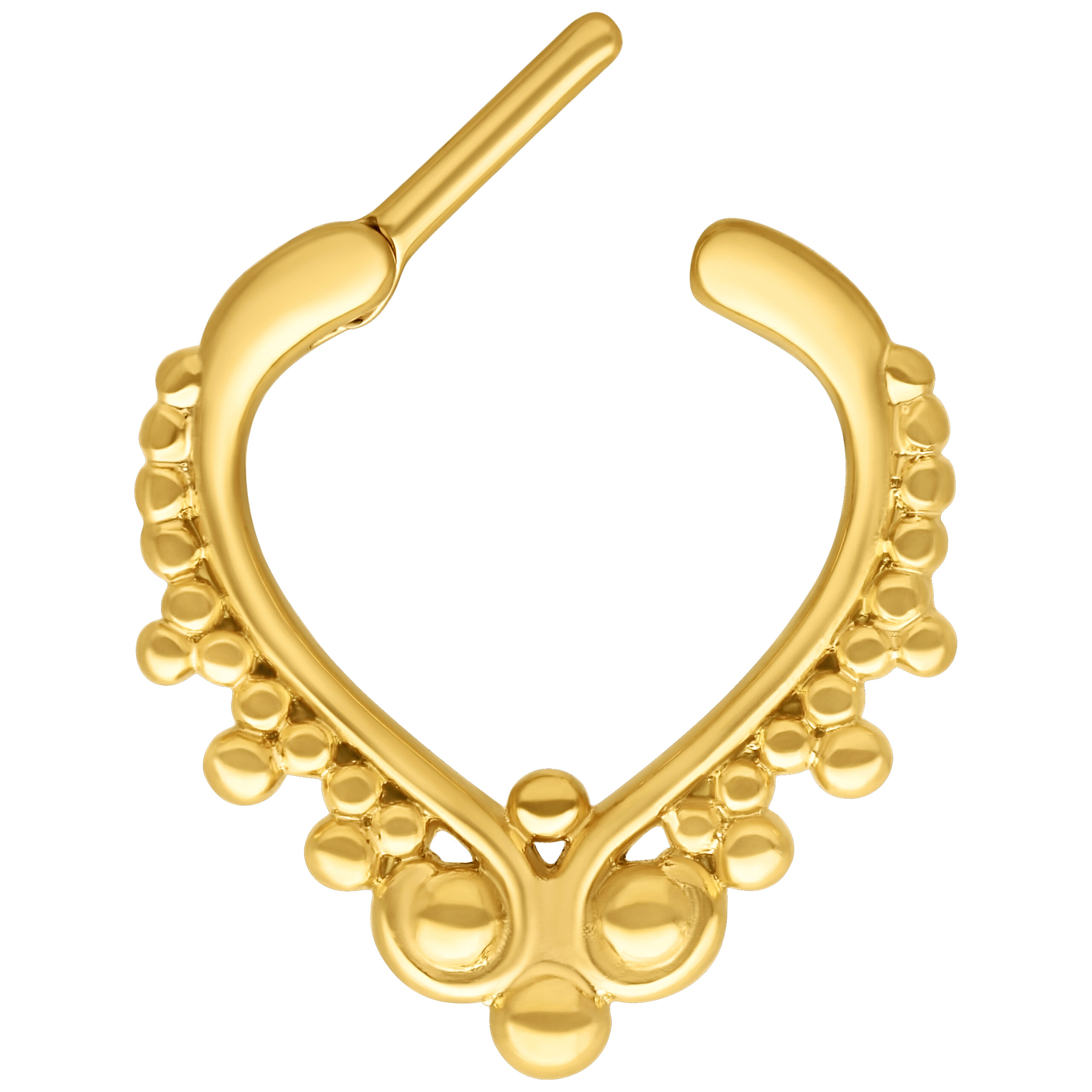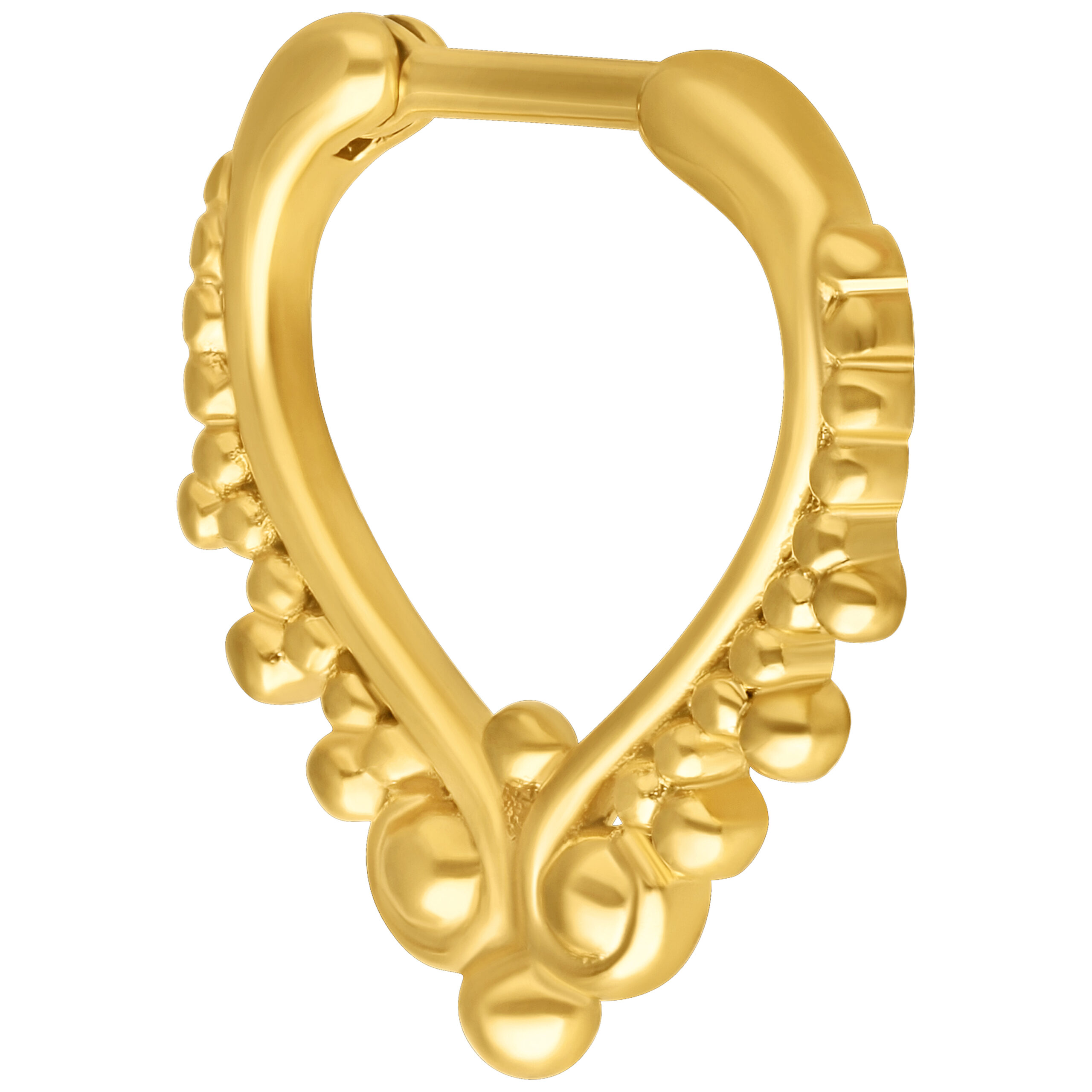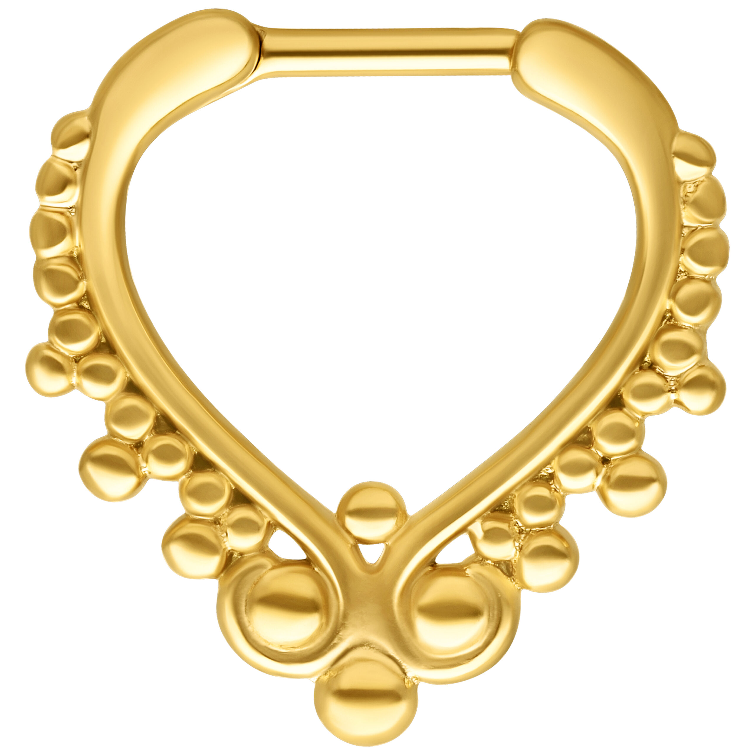 Nuestro Wonderland Septum Clicker tiene un diseño increíblemente bonito y único. El piercing tiene un pequeño toque de Oriente, y su color dorado lo convierte en un auténtico llamativo. El Septum Piercing cuenta con una barra recta de acero inoxidable con bisagra de aproximadamente 6,0 mm de longitud. Gracias a su cierre de clic, el piercing es muy fácil de abrir y colocar. Alternativamente, el piercing también se puede usar, por ejemplo, para tu Daith Piercing.