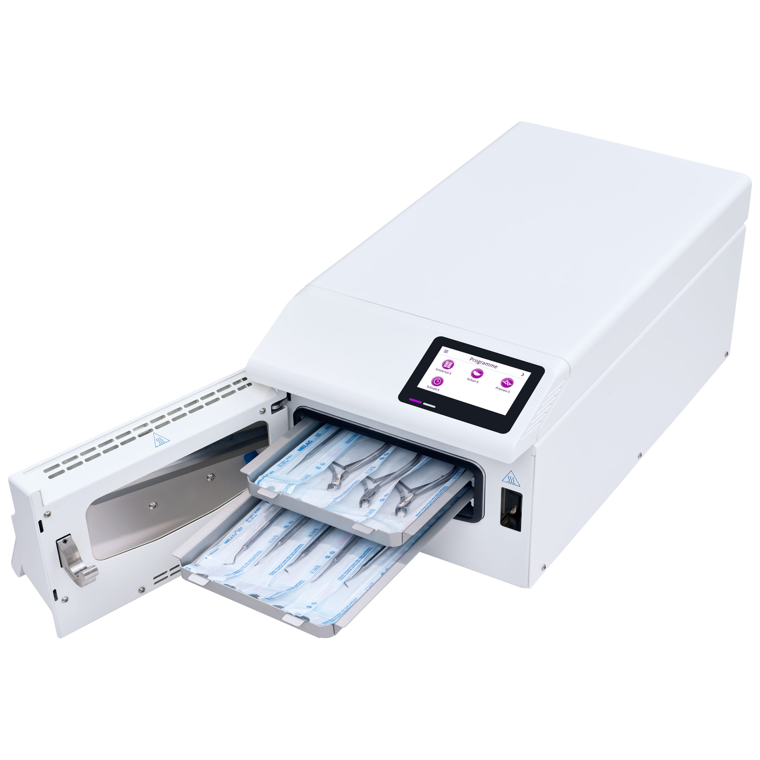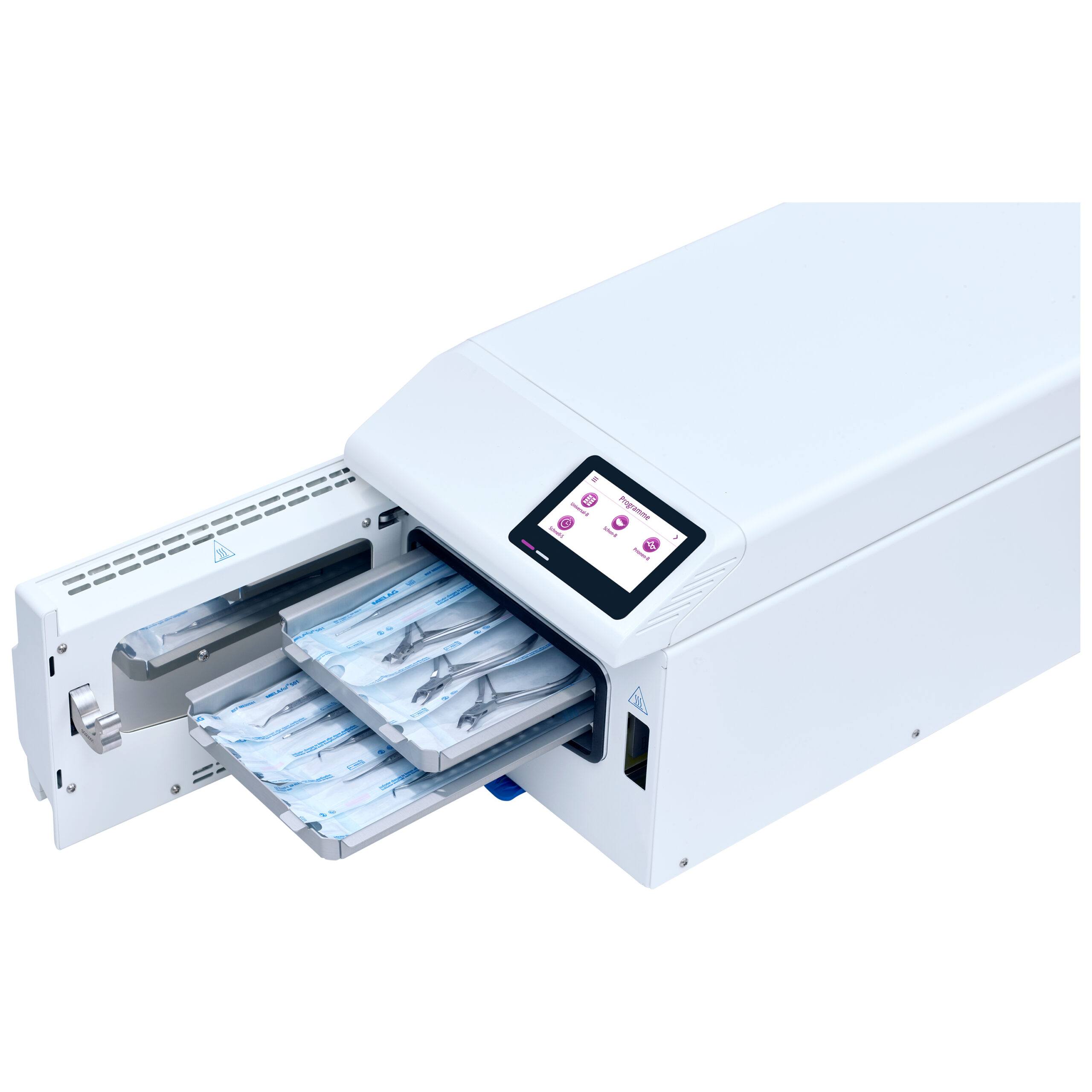 Ya sea como equipo independiente o como complemento de tu Autoclave, la cámara de esterilización de 5 litros ofrece con 2 bandejas suficiente espacio para la esterilización ultrarrápida de instrumentos.